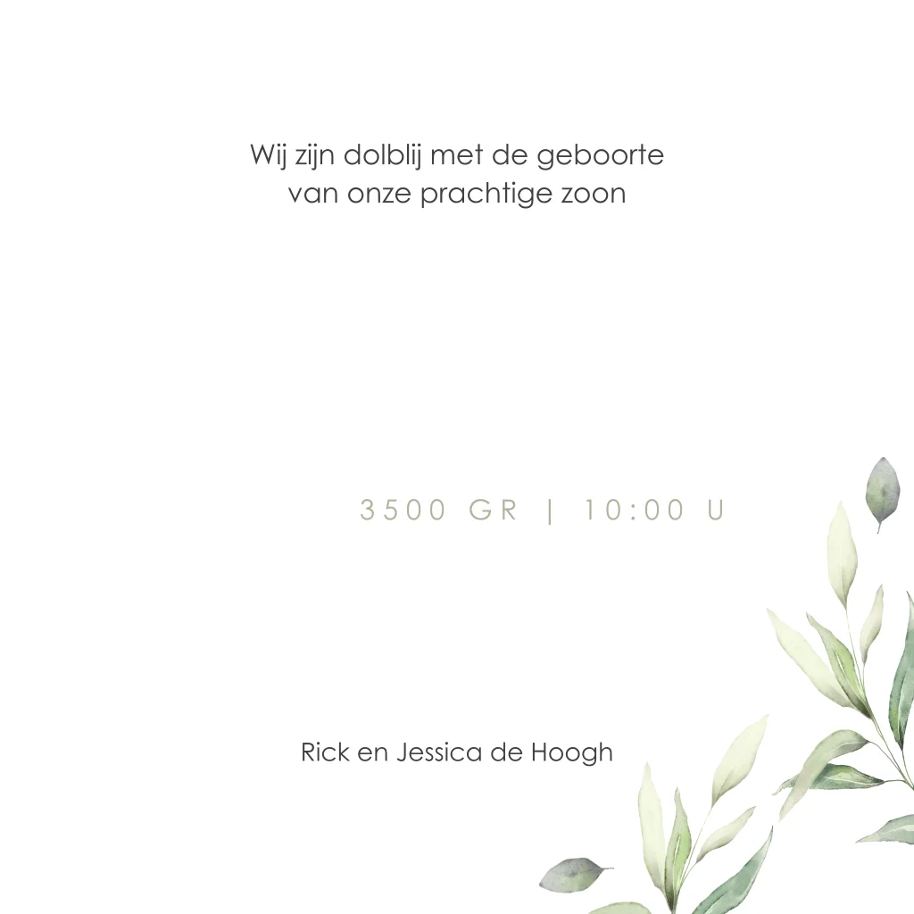 Goudfolie geboortekaartje met groene waterverf en botanische blaadjes. Stijlvol geboortekaartje met mooie groene waterverf. De subtiele bladeren geven de kaart een botanisch tintje. Op de voorkant wordt de naam van jullie pasgeboren zoontje met goudfolie gedrukt, hierdoor wordt het kaartje net even iets specialer. Benieuwd naar dit ontwerp, bestel een gepersonaliseerde drukproef.