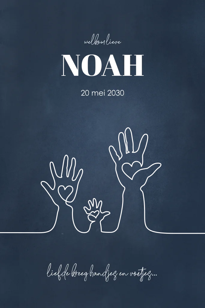 Geboortekaartje met monoline van drie handjes in goudfolie voor een jongen. Lijntekeningen zijn hot! Deze stijlvolle geboortekaart met goudfolie is helemaal van nu door de minimalistische uitstraling. Op de voorkant zie je drie handen die uit een lijn zijn getekend op een donkerblauwe achtergrond. Met dikke gouden letters staat de naam van je zoontje voorop de kaart. Pas de kleuren en lettertypes aan om je kaartje te personaliseren en bestel een drukproef.