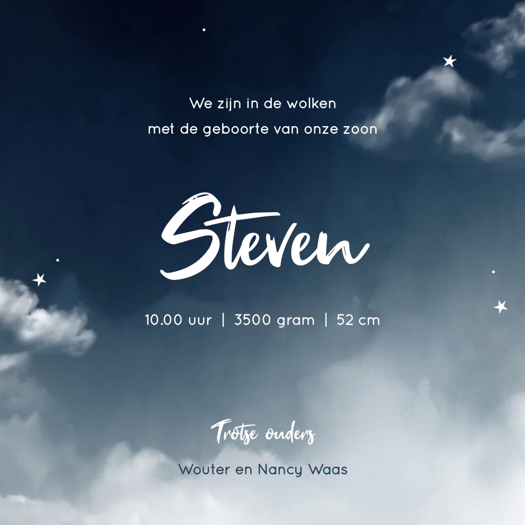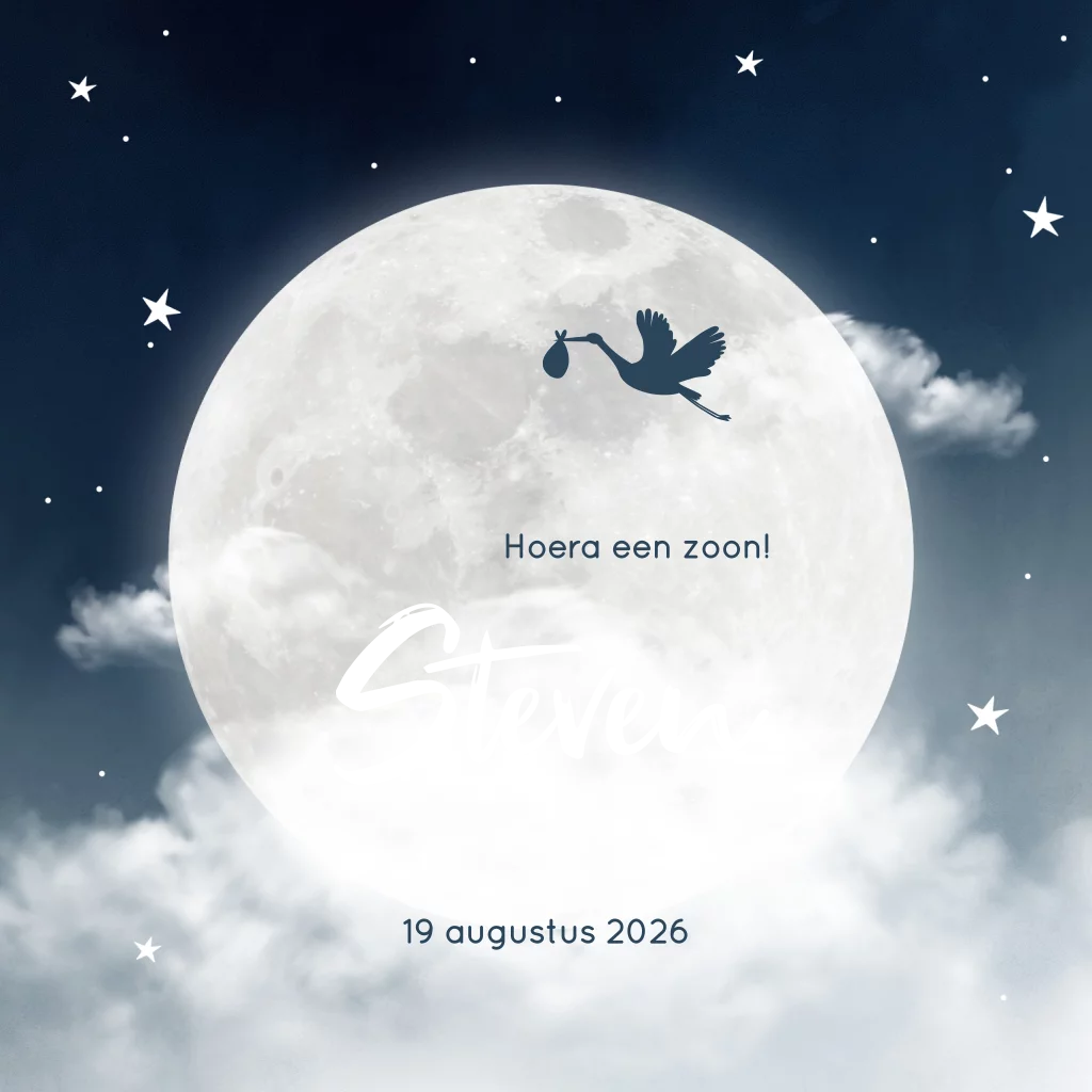 Dromerig geboortekaartje met naam in goudfolie. De ooievaar vliegt voor de volle maan met wolken op de achtergrond. Op zoek naar net even iets anders voor het geboortekaartje van je zoontje? Kies voor dit dromerige ontwerp met volle maan en sterren. De wolken zorgen voor extra diepte in het kaartje. De naam staat in een hip lettertype met goudfolie. Pas het ontwerp naar wens aan in de ontwerptool.