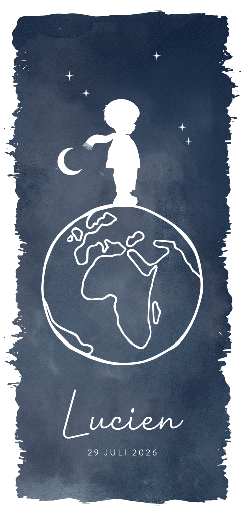 Verwachten jullie binnenkort een lief jongetje? Hoe leuk is dit geboortekaartje met silhouet van een jongetje op de wereld. De wereldbol en de maan zijn gedrukt met goudfolie en spatten van het kaartje af. Op de achterkant kun je de geboorteteksten plaatsen en is er ruimte voor een gedichtje.