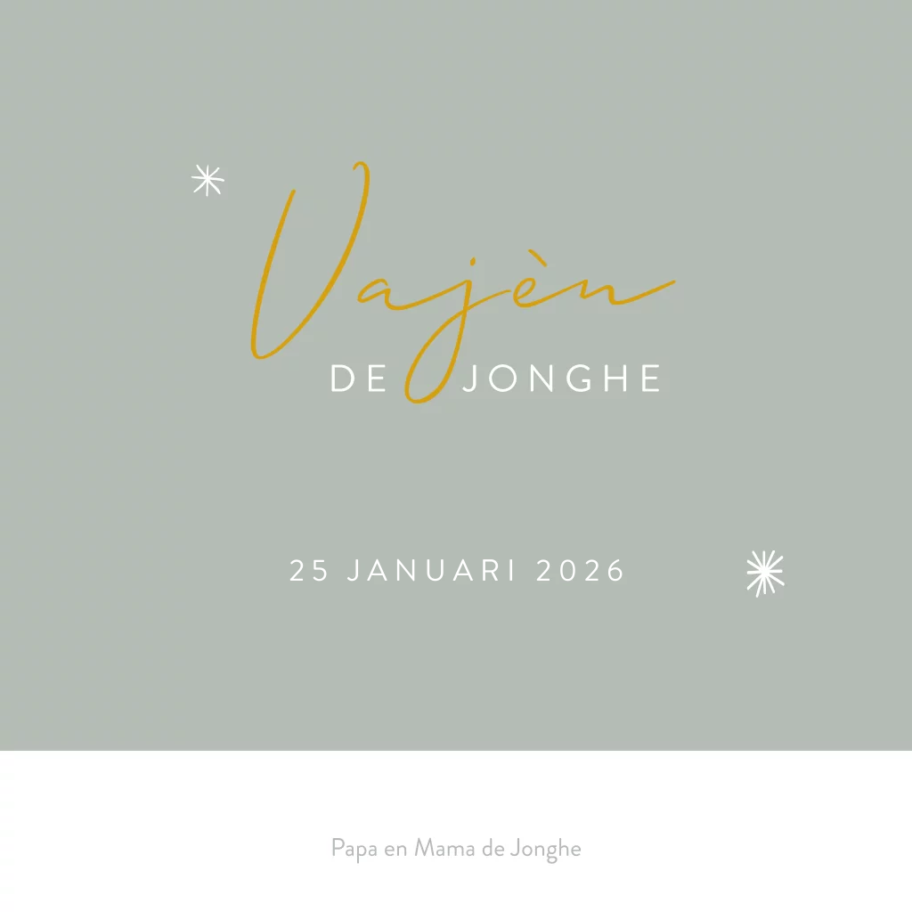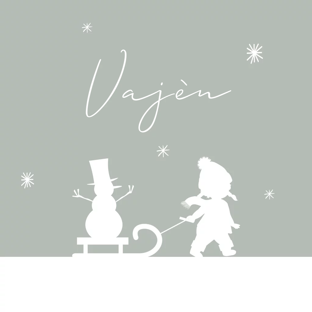 Grijsgroen geboortekaartje met silhouet meisje met slee en goudfolie. Zwanger in de winter? Dan hebben wij een leuk geboortekaartje voor jou. Dit lieve ontwerp heeft een lichtgroene achtergrond en sneeuwvlokken ter decoratie. Je ziet een meisje met een sleetje op de voorzijde. De naam is met een hip en sierlijk lettertype met goudfolie gedrukt. Pas de kaart naar wens aan en bestel een drukproef.