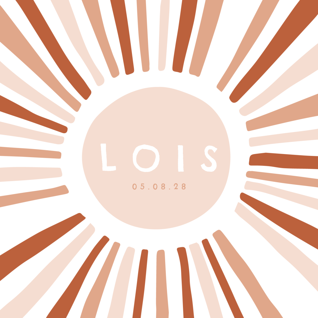 Dit geboortekaartje heeft subtiele hinten naar de zomer. Zo bestaat het kleurrijke patroon op het kaartje uit allerlei zonnenstralen in de kleuren roze, blush en roestkleur. De naam en sommige stralen worden afgedrukt met glanzende foliedruk in de kleur goud. Op de achterzijde is ruimte voor de adres- en geboortegegevens. Pas de kaart naar wens aan. Dit ontwerp is namelijk ook heel mooi met koperfolie.