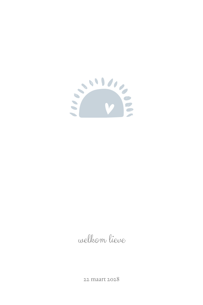Ben jij een fan van minimalisme en de zomer? Dan hebben wij een leuk geboortekaartje voor jouw pasgeboren zoontje. Dit chique ontwerp heeft niet veel nodig om het stralend middelpunt te zijn. De kaart heeft een zonnetje op de voorzijde in combinatie met lichtblauwe en goudfolie accenten. Op de achterzijde is ruimte voor de geboorte- en adresgegevens. Pas de kleuren naar wens aan in onze designtool.