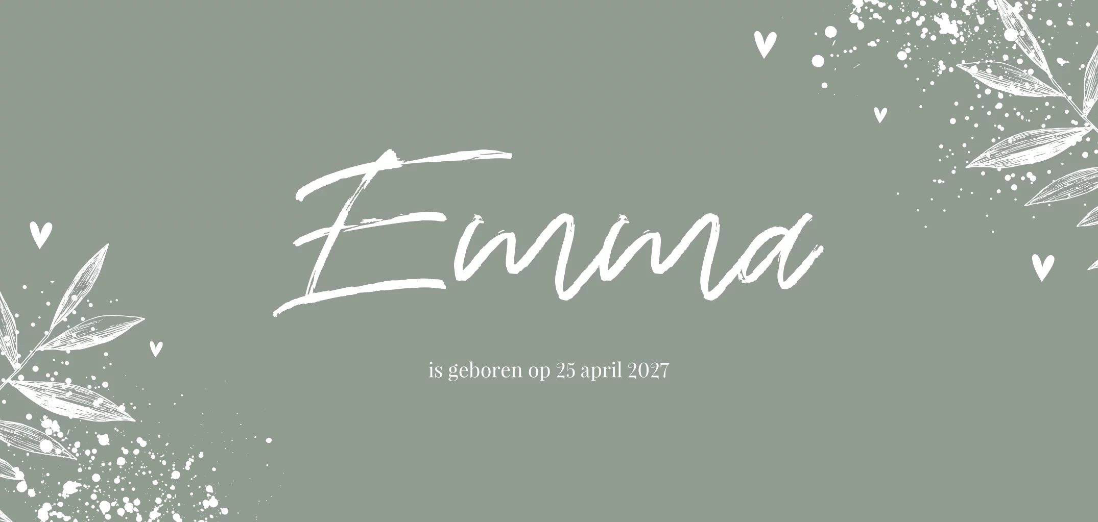 Langwerpig geboortekaartje met gouden spetters en bladeren. Is een simpele kaart jouw stijl? Neem dan eens een kijkje bij dit geboortekaartje. Dit langwerpige, grijsgroene kaartje is versierd met gouden verfspetters en blaadjes. Dit chique kaartje heeft voldoende ruimte over voor alle geboortegegevens.