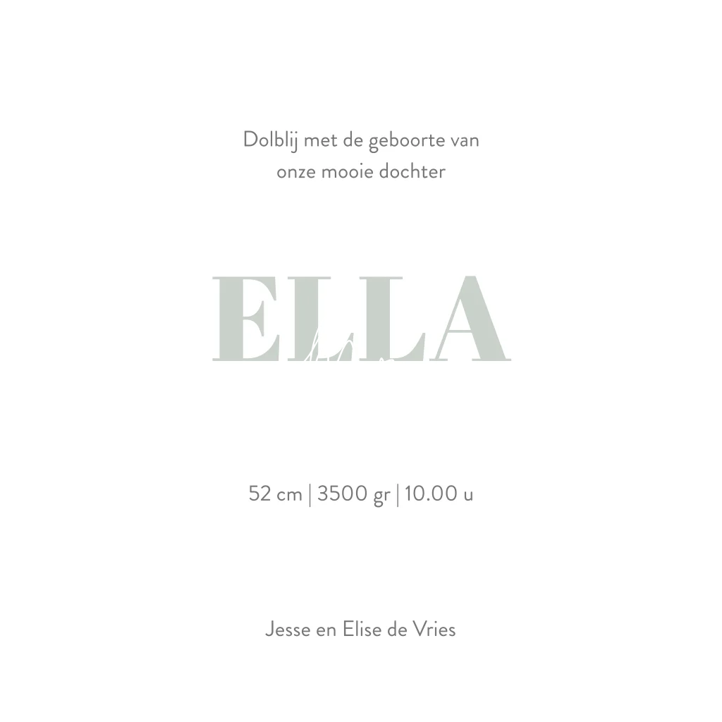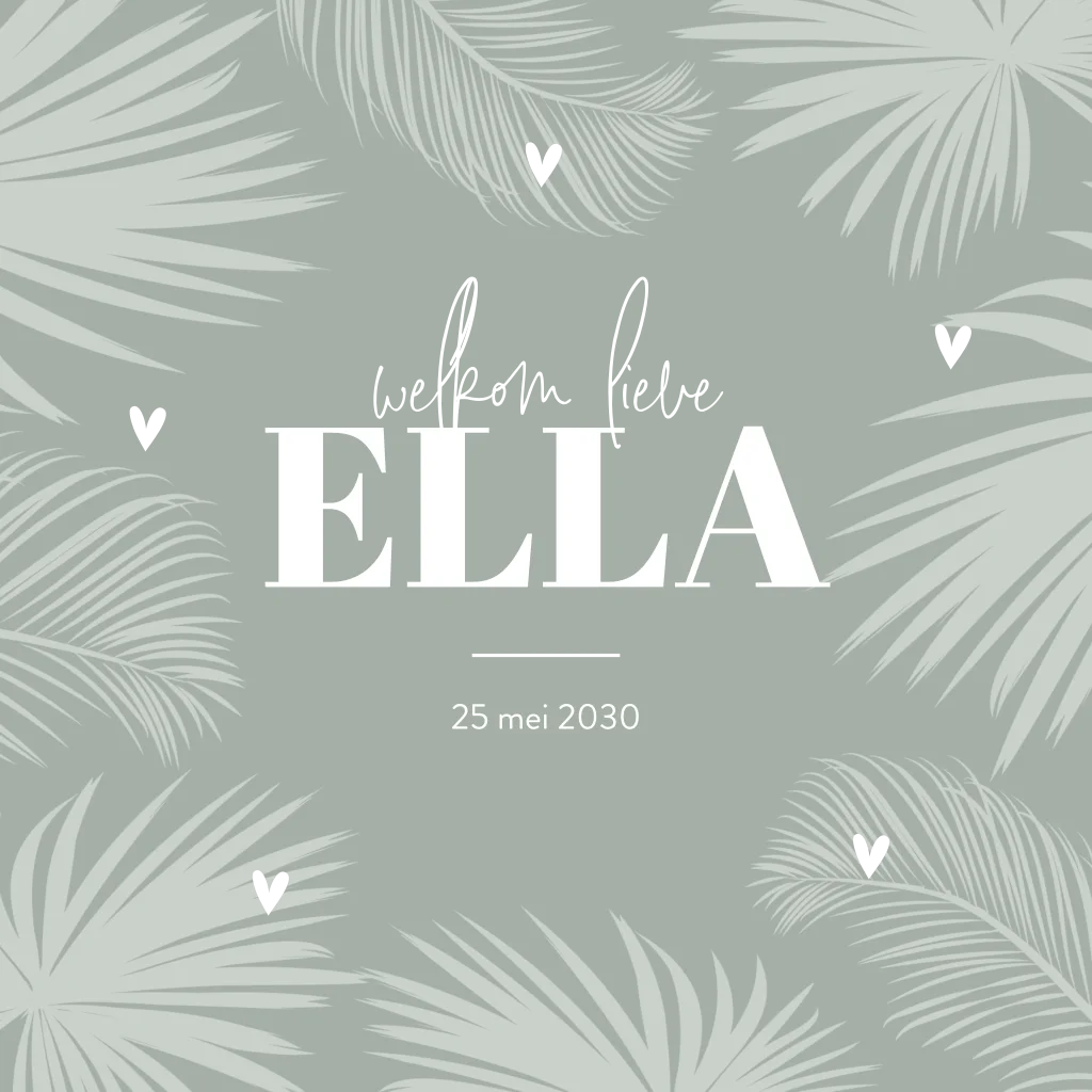 Grijsgroen geboortekaartje met bladeren en koperfolie. Stijlvol geboortekaartje op vierkant formaat. Dit grijsgroene ontwerp heeft een subtiel patroon van bladeren en koperfolie accenten. De hartjes maken het ontwerp af. In de kaart is ruimte voor een gedichtje en geboortegegevens. Pas het ontwerp naar wens aan door de kaart in de ontwerptool een andere achtergrondkleur of een ander lettertype toe te kennen. Bestel vervolgens een drukproef en bekijk de geboortekaart in het echt.