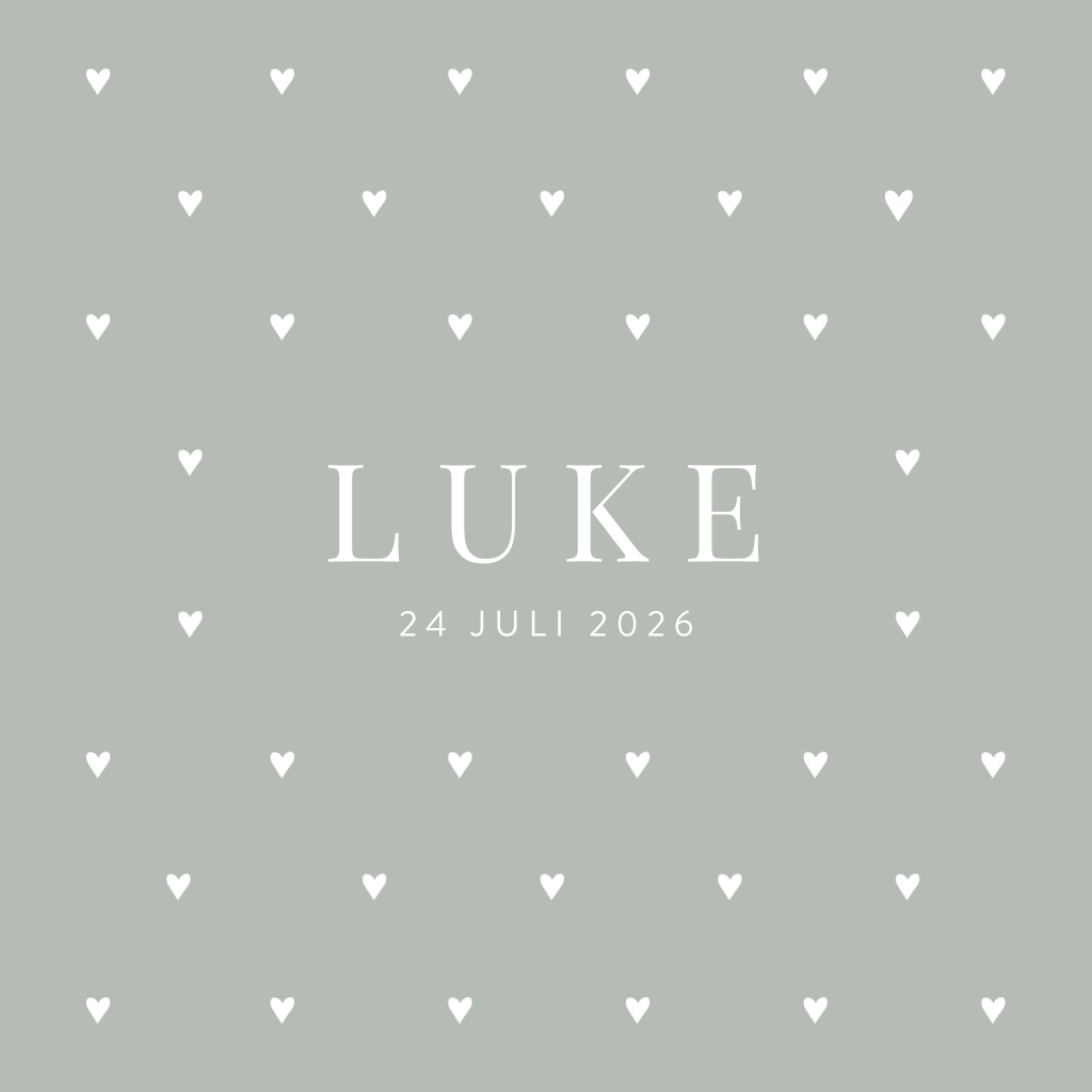 Groen vierkant geboortekaartje met patroon van witte hartjes en naam in goudfolie. Kies voor dit lieve geboortekaartje om de geboorte van jullie zoon aan te kondigen. Het eenvoudige ontwerp is extra bijzonder doordat de naam en een enkel hartje met goudfolie is gedrukt. In de ontwerptool kun je het geboortekaartje naar wens aanpassen.