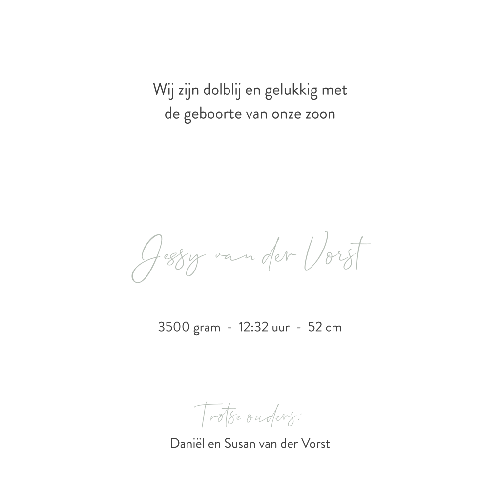 Groen geboortekaartje met witte hartjes en naam in goudfolie