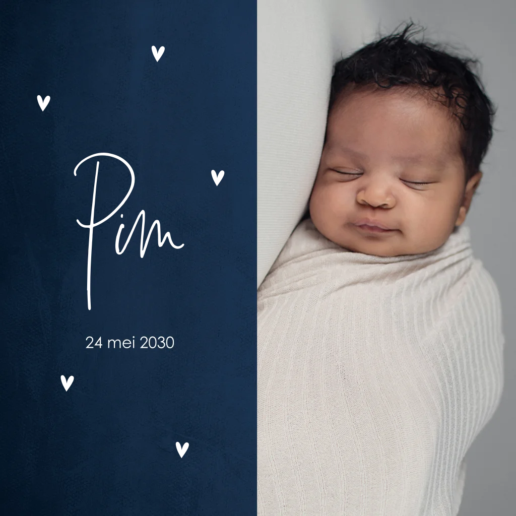 Hip donkerblauw geboortekaartje met koperen hartjes