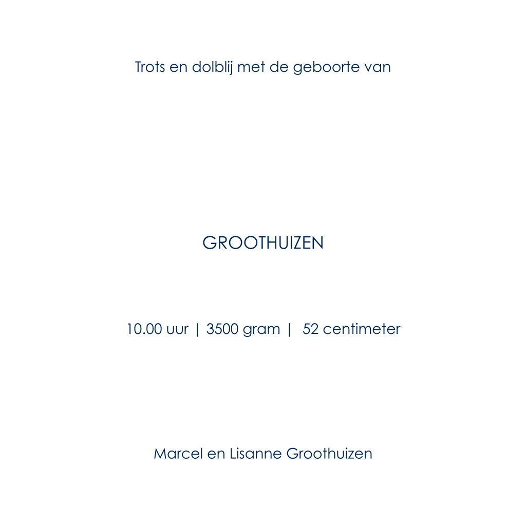 Hip donkerblauw geboortekaartje met koperen hartjes en foto. Op zoek naar een mooi geboortekaartje? Wat dacht je van dit mooie foto geboortekaartje voor jouw zoontje. Op voorkant zie je de naam staan omringt door kleine hartjes, beide zijn gedrukt met koperfolie dus spatten van de kaart af. Daarnaast is ruimte voor een mooie foto van jullie zoon. In de kaart is ruimte voor een gedichtje en alle geboortegegevens.