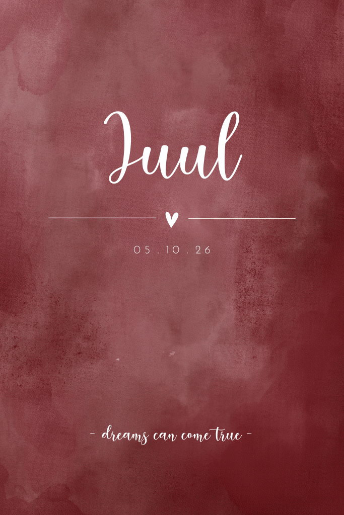 Verwacht jij binnenkort een meisje? Dan is dit enkel geboortekaartje met donkerrood waterverf heel mooi. Less is more! De donkerrode waterverf achtergond geeft een mooie invulling op de kaart en het enige wat jij hoeft te doen is alle gegevens aan te passen. Het hartje en de quote zijn met goudfolie gedrukt. Vergeet ook geen proefdruk te bestellen om te zien hoe de kaart er in het echt uitziet!