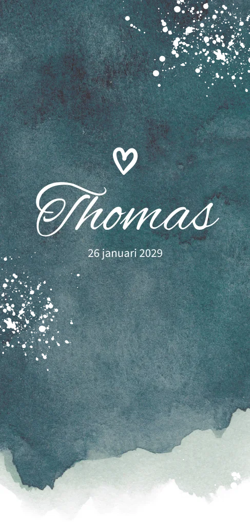 Staand geboortekaartje met blauwe waterverf en gouden spetters. Dit stijlvolle geboortekaartje heeft mooie aquablauwe kleur en is versierd met gouden spetters. De gouden spetter worden met goudfolie gedrukt waardoor ze ook echt van de kaart af spatten. Met speelse en chique typografie staat voorop de naam van jullie lieve mannetje. Achterop staan alle geboortegegevens.
