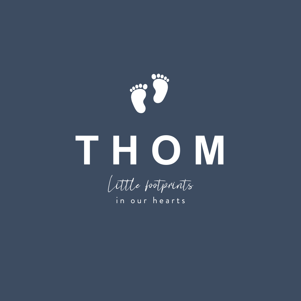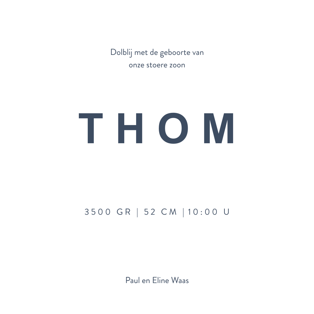 Donkerblauw geboortekaartje voor een jongen met babyvoetjes in goudfolie. Stoer geboortekaartje met minimalistische uitstraling. Dit vierkante ontwerp heeft een donkerblauwe achtergrond. Boven de vette typografie met de naam van je zoontje staat een lieve illustratie van twee babyvoetjes, gedrukt met goudfolie. De lieve quote daaronder maakt het kaartje helemaal af, hier kun je natuurlijk ook een eigen lieve tekst toevoegen. Bestel een proefdruk met jullie naam erop om het gedrukte resultaat te beoordelen.