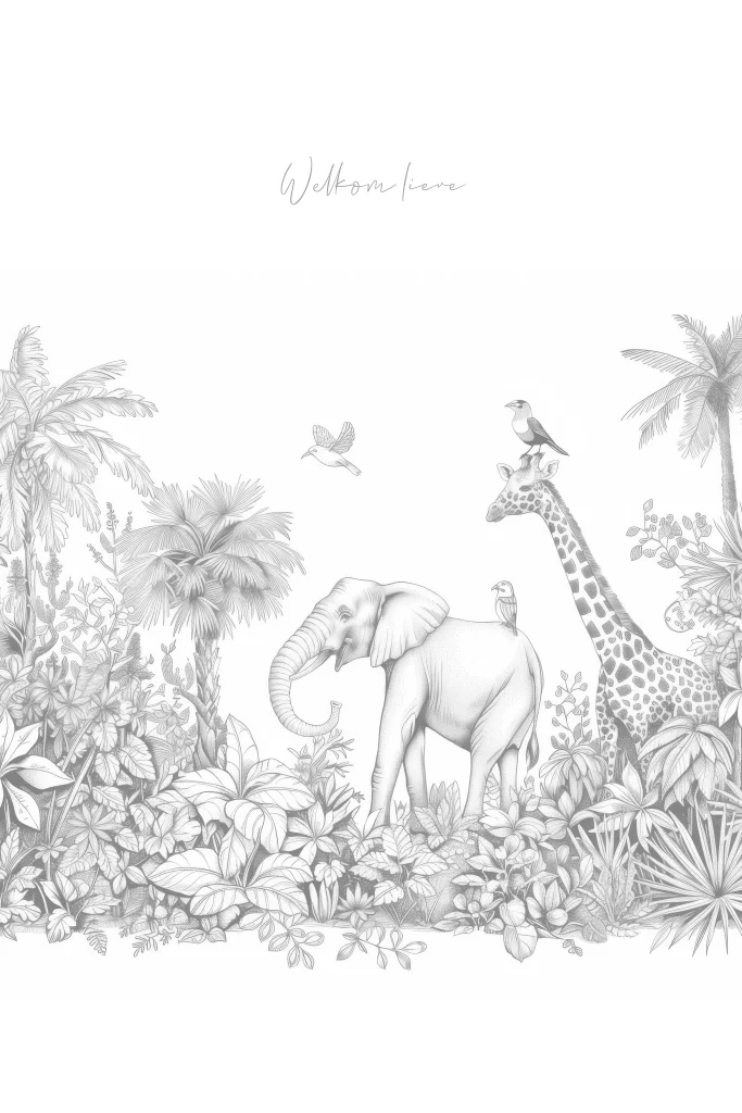 Zo zacht dit jungle geboortekaartje in grijstinten. Een olifant en giraf lopen in de jungle tussen de palmbomen. Er zit een vogeltje op de rug van de olifant en op het hoofd van de giraf. De naam staat in goudfolie maar pas de foliekleur naar wens aan.