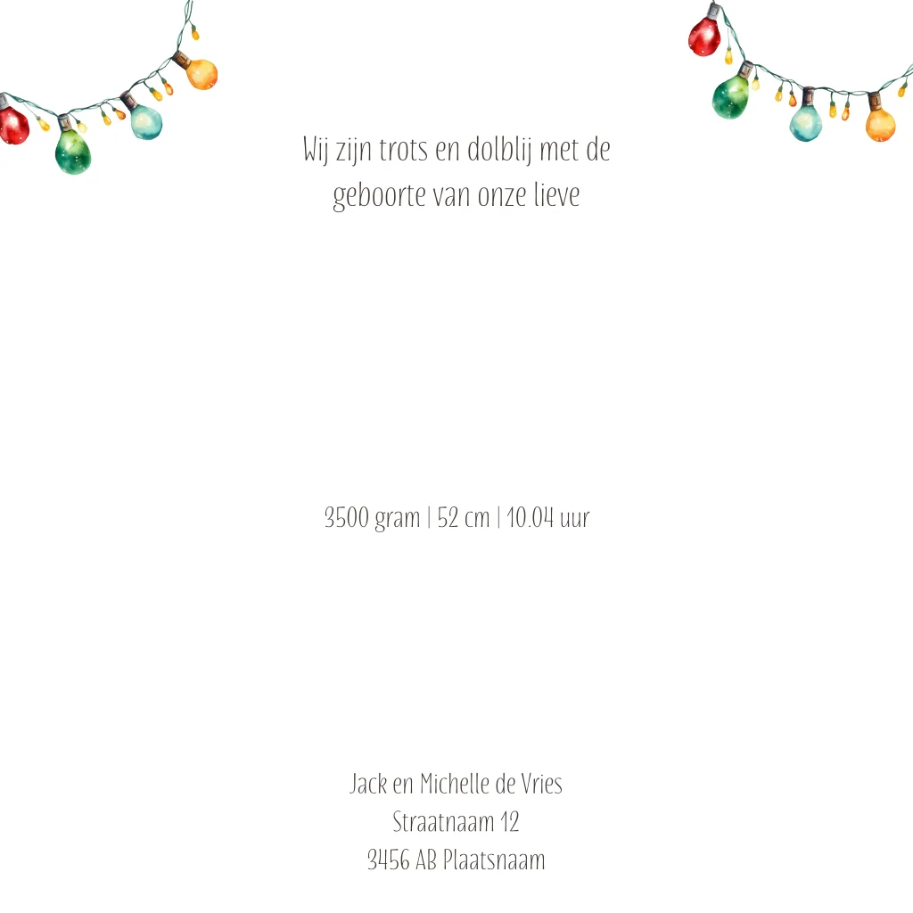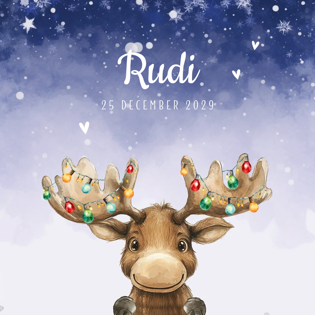 Wordt jullie kindje geboren rondom de feestdagen bekijk dan eens dit betoverende kerst geboortekaartje. Het schattige rendier met kleurrijke kerstlichtjes in zijn gewei staat tegen een diepe blauwe sterrennacht vol sneeuwvlokken. Perfect voor een kindje dat geboren wordt in de maand december en waarmee jullie dit bijzondere nieuws extra magisch kunnen delen.