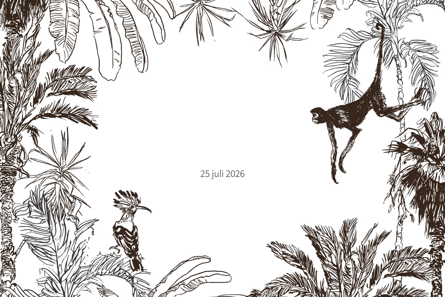 Roségoudfolie geboortekaartje met illustratie van aapje en een koppige vogel in jungle. De jungle trend is nog steeds erg populair. Daarom hebben we dit getekende geboortekaartje met jungledieren toegevoegd aan de webshop. De kaart heeft een geïllustreerde rand van tropische bladeren, palmbomen en jungle dieren. Met een dun en stijlvol lettertype staat de naam van je dochter in het midden van de kaart.