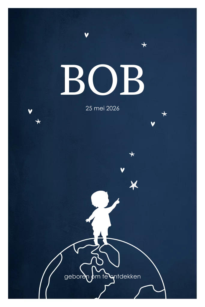 Donkerblauw geboortekaartje met stijlvolle typografie en goudfolie hartje om de geboorte van een jongen aan te kondigen. Less is more! Dat geldt ook voor deze chique geboortekaart met goudfolie. Dit ontwerp heeft niet meer nodig dan een wit kader, een donkerblauwe achtergrond en goudfolie accenten. De naam staat met grote en stijlvolle typografie in het midden van de kaart.