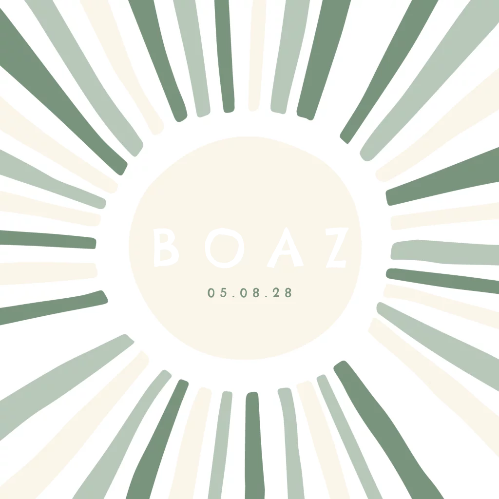 Een trendy en vrolijk geboortekaartje met afgeronde hoeken. Op de voorkant staat een grafische tekening van een zon met groene, gele en gouden zonnestralen. De naam van je zoontje komt in het midden te staan. Op de achterzijde is ruimte voor de adres- en geboortegegevens. Pas de kaart naar wens aan en bestel een proefdruk.