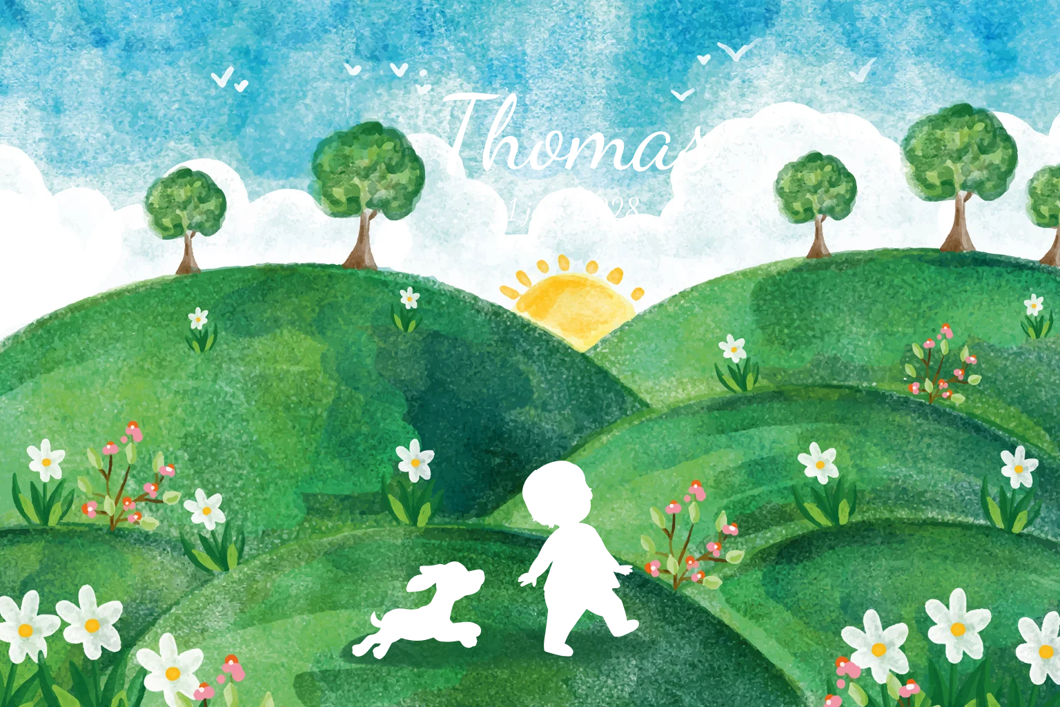 Vrolijk geboortekaartje met een silhouet van een jongetje en hondje die samen wandelen door een schilderachtig groen landschap. Het silhouet is in koperfolie, pas het aan in je eigen kleur. Prachtige heuvels, bedekt met bloemetjes, sieren het landschap terwijl de zon langzaam opkomt.