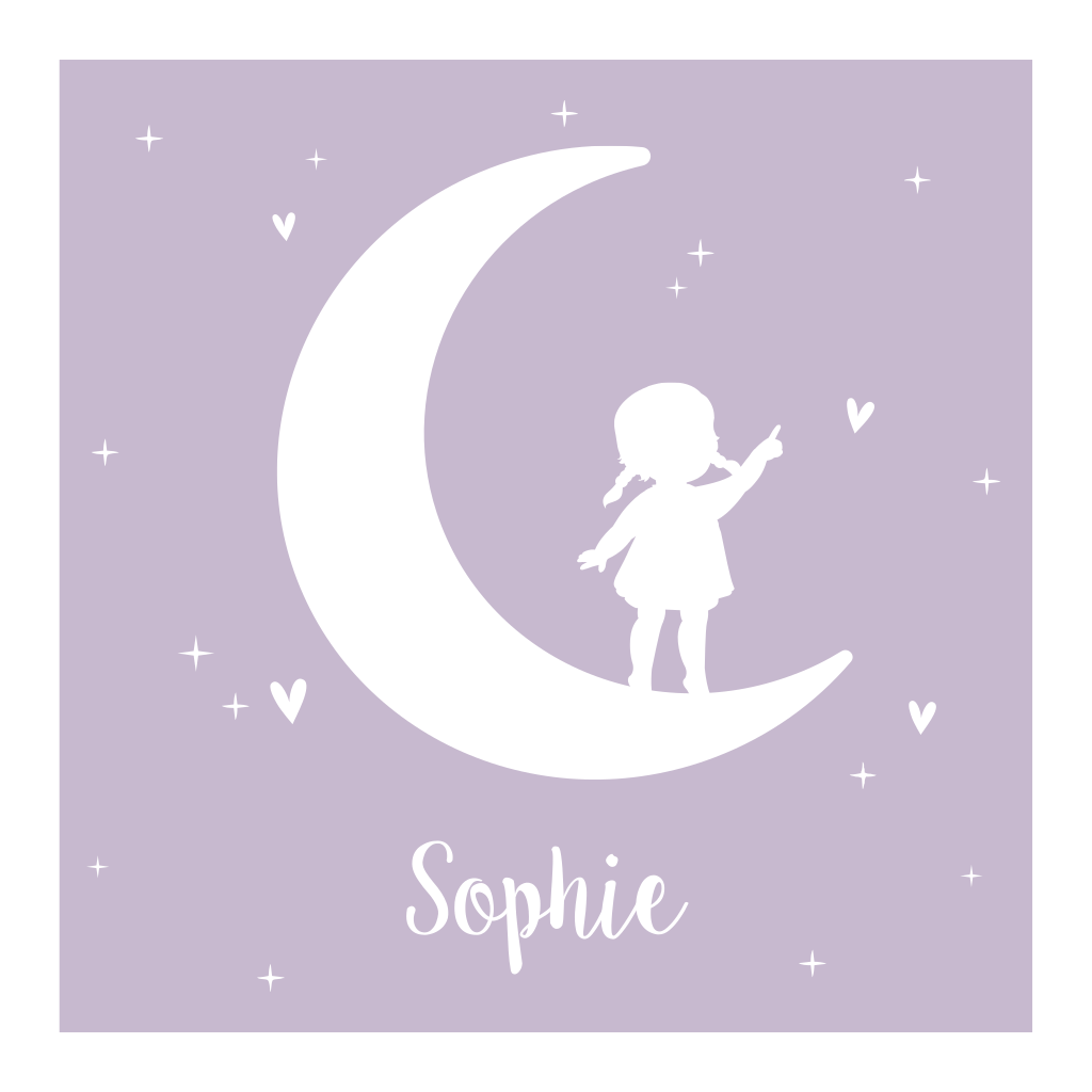 Lila geboortekaartje met silhouet meisje op maan en goudfolie