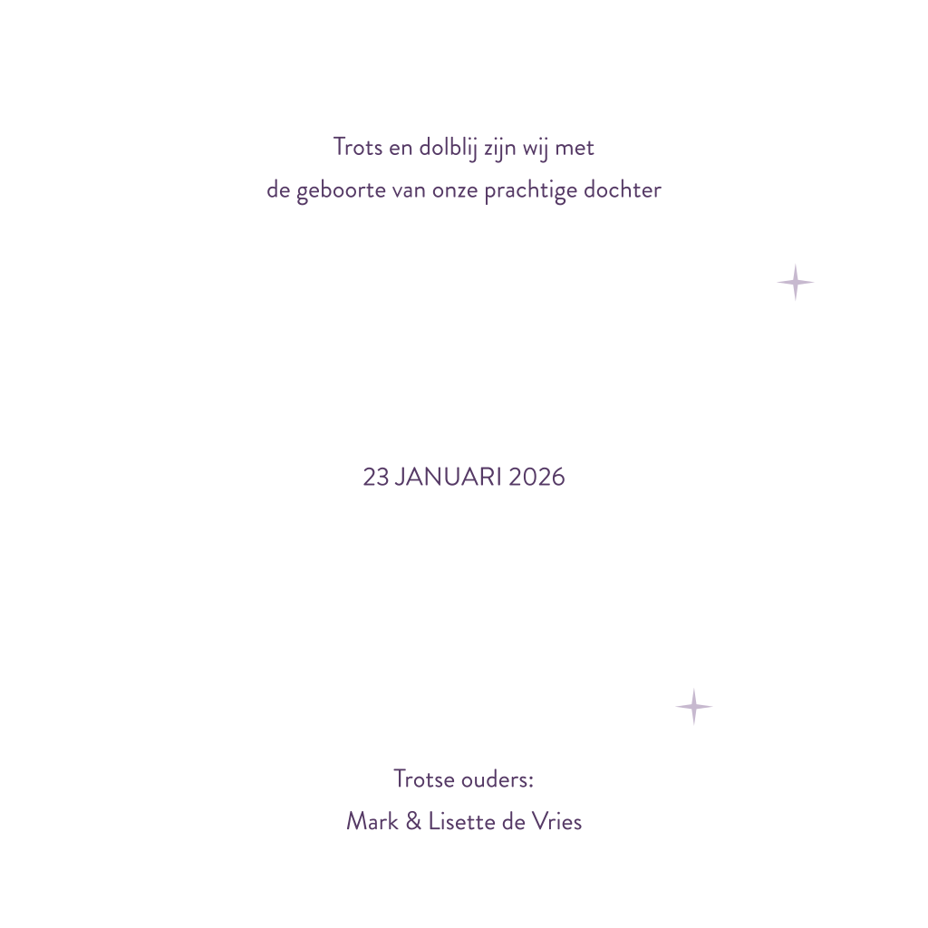 Op dit lieve geboortekaartje worden meerdere trends met elkaar gecombineerd: goudfolie, silhouetjes en de maan en sterren. De achtergrondkleur van dit vierkante kaartje is lila, toch liever roze, groen of geel? Geen probleem! Pas de kleuren eenvoudig aan in onze ontwerptool. De goudfolie afwerking zorgt voor een mooi, glimmend effect en zorgt voor net dat beetje extra.
