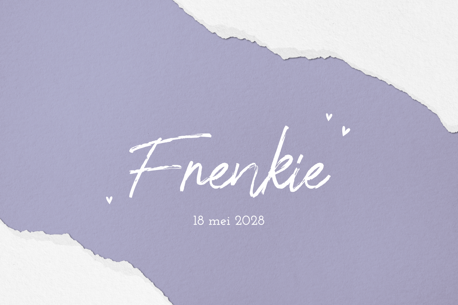 Zoek je een stoer geboortekaartje voor jouw zoontje? Dit lilapaars exemplaar met op de hoeken gescheurd wit papier heeft absoluut een stoere look. De naam is gedrukt met regenboogfolie en schittert in het licht. Op de achterzijde komt deze lilapaarse achtergrond en een wit gescheurd papier terug.