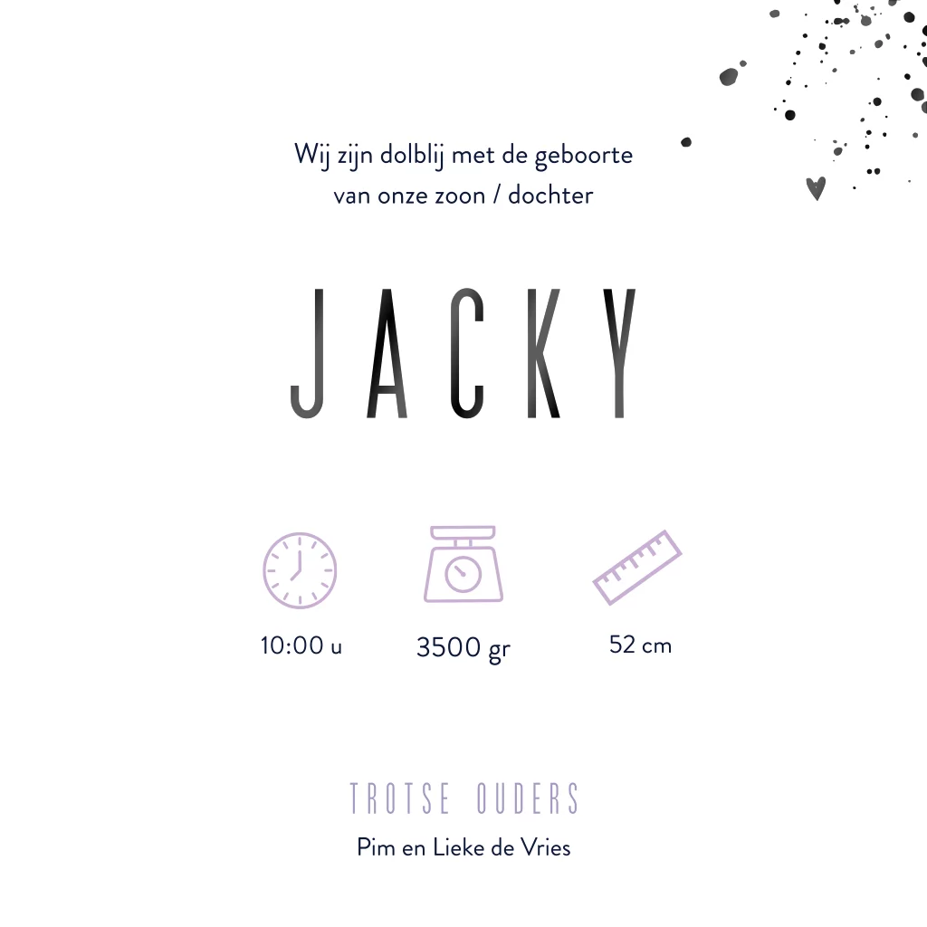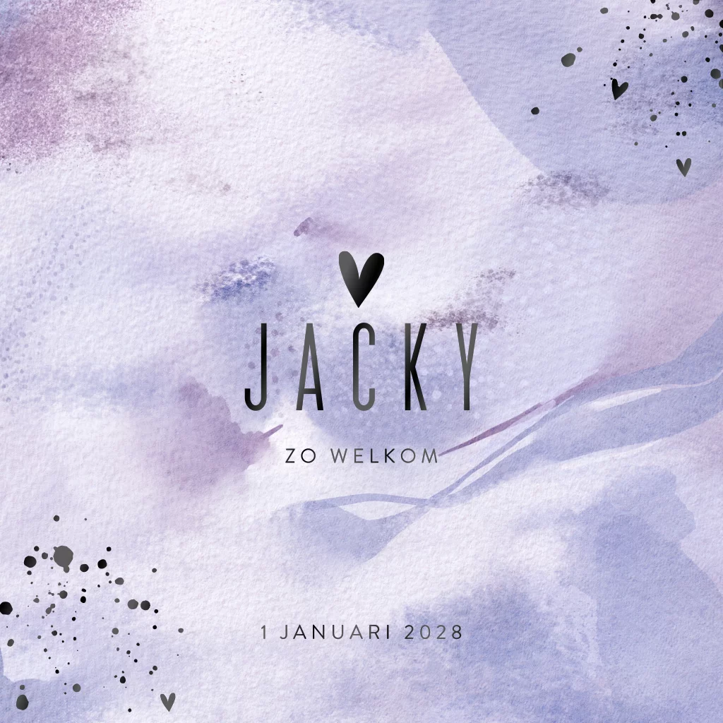 Stoer geboortekaartje voor een jongen of meisje met een paarse waterverf achtergrond. De naam, hartjes en spetters worden gedrukt in hoogglans zwart, dat maakt het geboortekaartje extra bijzonder! Pas het ontwerp eventueel naar eigen inzicht aan in onze designtool.