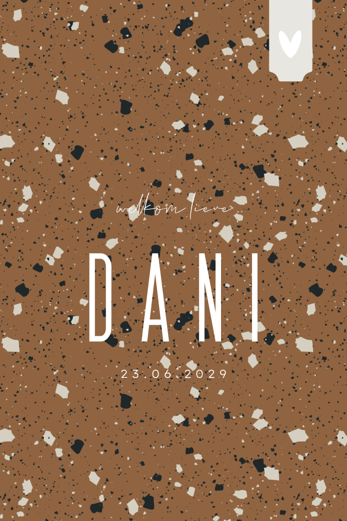 Stoer geboortekaartje in roestbruin met terrazzo patroon en beige met zwart. De naam staat in een mooi smal font in goudfolie. Deze hippe kaart kan zowel voor een jongen als meisje.