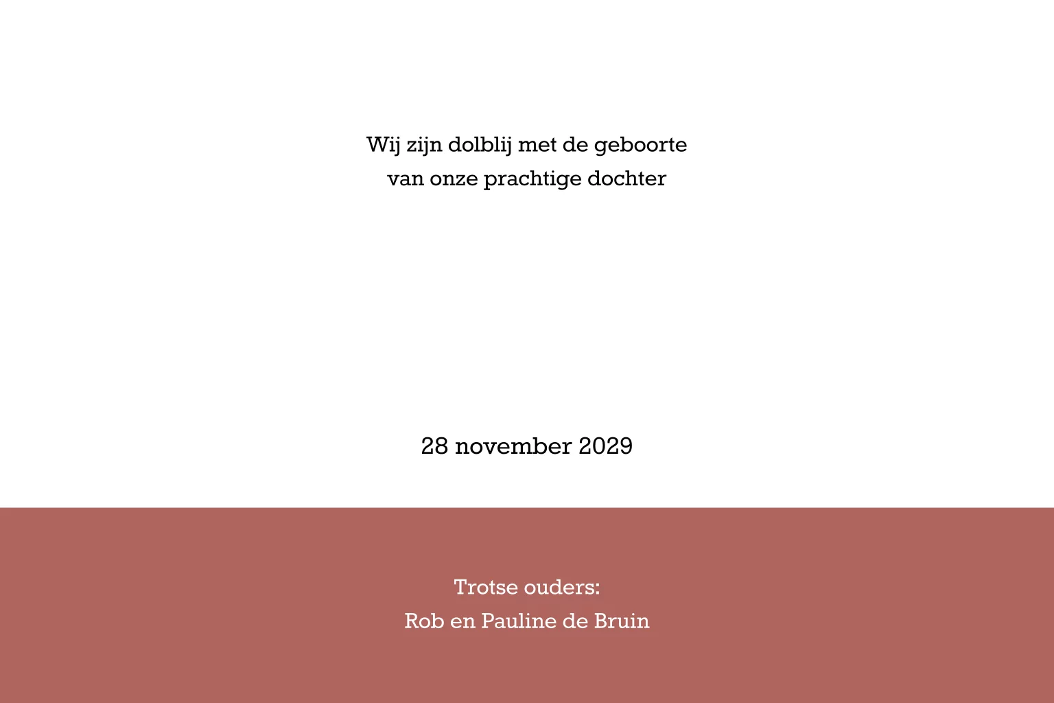 Stijlvol roestrood geboortekaartje met hartjes en naam in goudfolie. Dit lieve ontwerp heeft de naam van je dochtertje met speelse typografie op de voorzijde. De naam en de hartjes worden gedrukt met goudfolie. Pas het kaartje naar wens aan in de ontwerptool. Zo kun je hartjes toevoegen, lettertypes aanpassen en kleuren veranderen. Alles om jouw kaartje zo uniek mogelijk te maken.