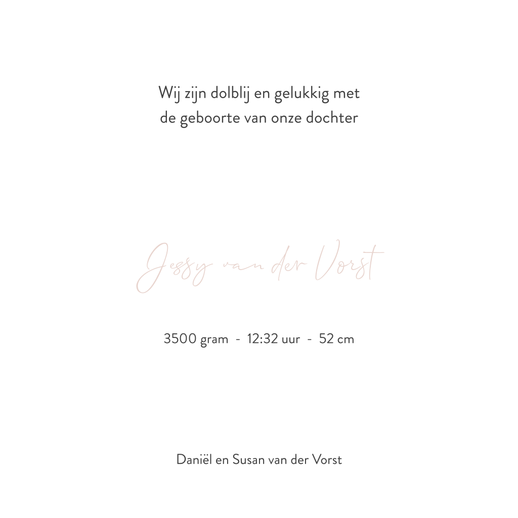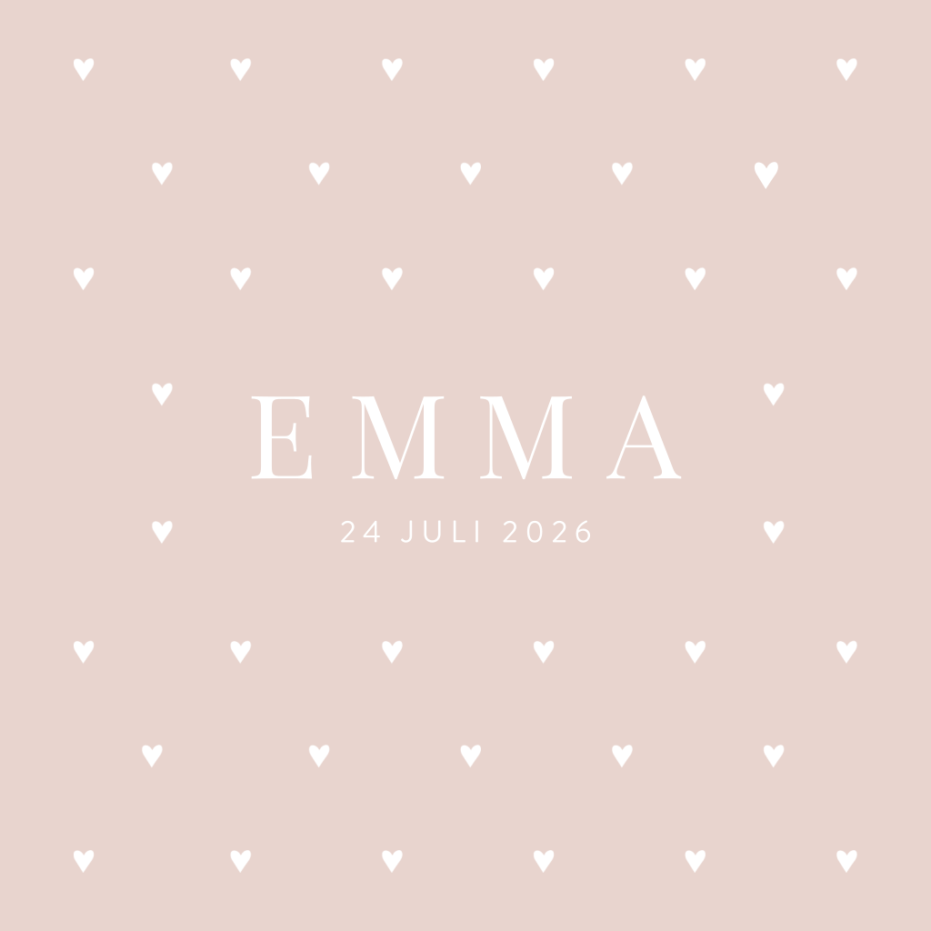 Roze vierkant geboortekaartje met witte hartjes en naam in goudfolie. Dit roze geboortekaartje is versierd met witte hartjes en heeft een vierkant formaat. Het simpele ontwerp heeft een klassieke uitstraling door goudfolie en het stijlvolle lettertype. Op de voorzijde springt één van de hartjes eruit door de gouden glans. Pas de kaart geheel naar wens aan door de kleuren aan te passen, zo maak je het kaartje nog persoonlijker.