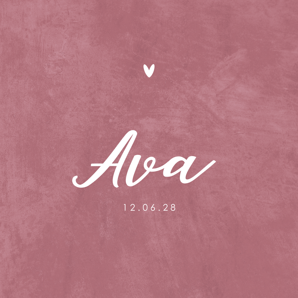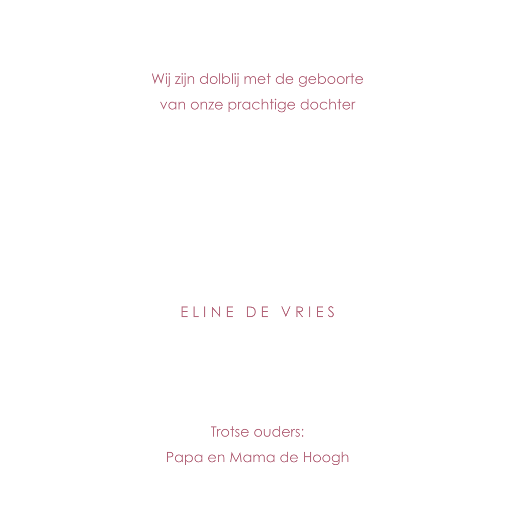 Een minimalistisch geboortekaartje in mooie, roze kleur met roségouden hartje en naam. Liever goudfolie of misschien koperfolie? Pas de kleuren eventueel aan in onze ontwerptool. Aan de binnenzijde is ruimte voor de geboortegegevens van je dochtertje én een lief gedichtje.