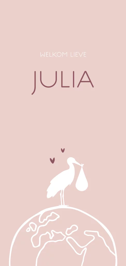 Leuk, enkel geboortekaartje met een roze achtergrond en een silhouet van een ooievaar. De ooievaar draagt een kindje en staat op een silhouet van een wereldbol. Op de voorkant is ruimte voor de naam, deze staat in donkerroze samen met de twee hartjes.