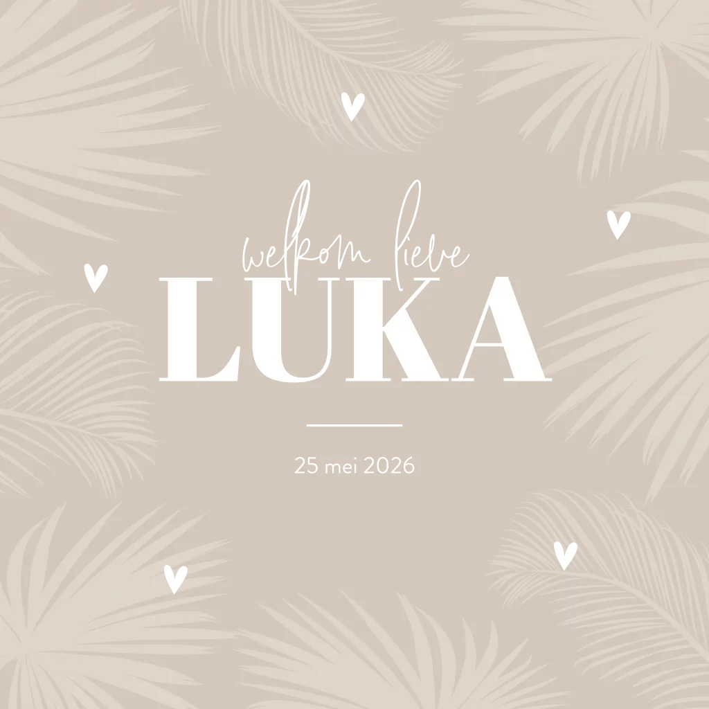 Goudfolie geboortekaartje met bladeren in een warme taupe kleur. Op zoek naar een mooi geboortekaartje volgens de laatste trends? Dit stoere ontwerp heeft een warme, hippe kleur en is omrand door tropische bladeren. De hartjes worden in goudfolie gedrukt. In de kaart is ruimte voor een gedichtje of een persoonlijke tekst. Ook kun je hier alle geboortegegevens kwijt.