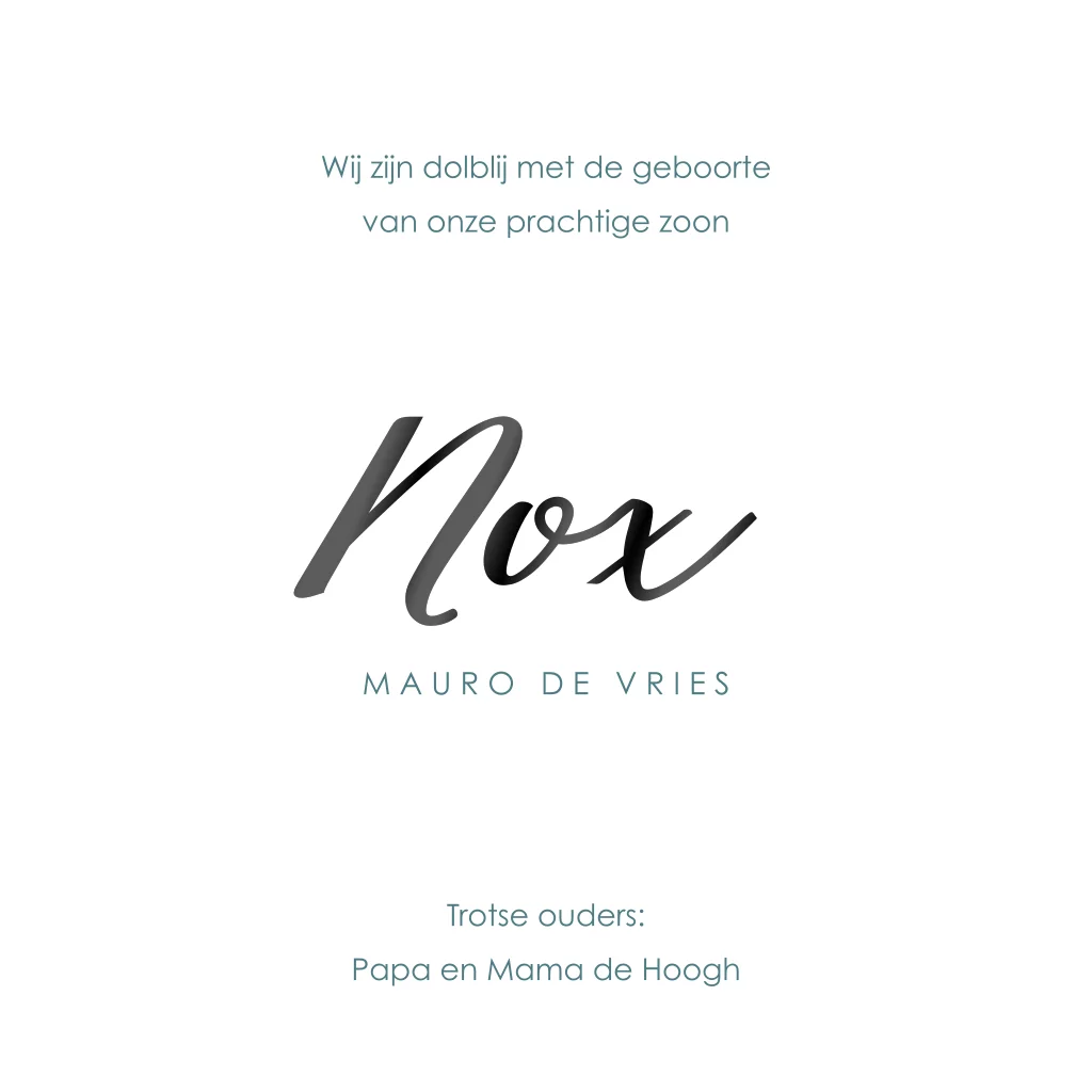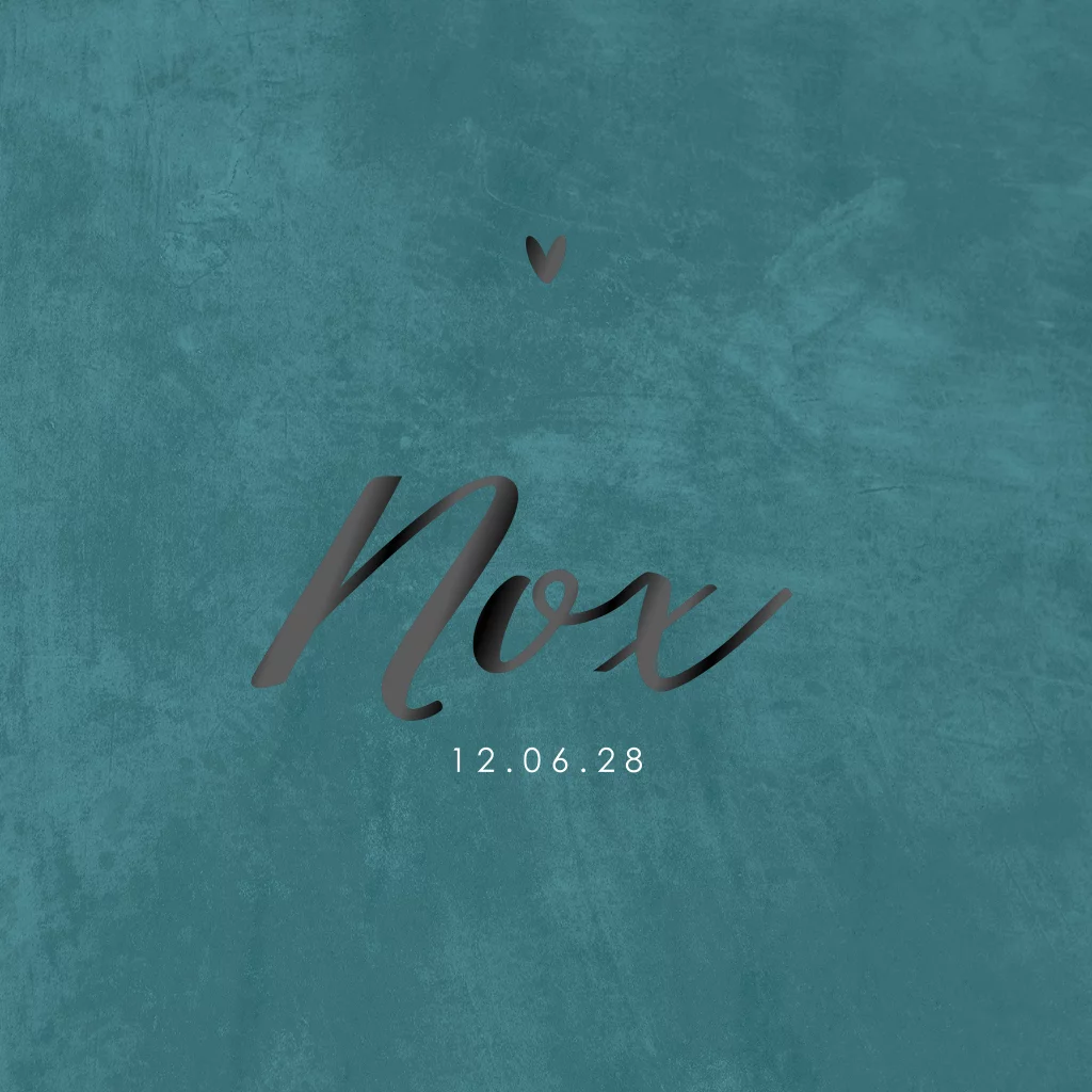 Een minimalistisch geboortekaartje in mooie, groenblauwe kleur met hoogglans zwart hartje en naam. Liever een andere kleur hoogglans of foliedruk? Pas de kleuren eventueel aan in onze ontwerptool. Aan de binnenzijde is ruimte voor de geboortegegevens van je zoontje én een lief gedichtje.