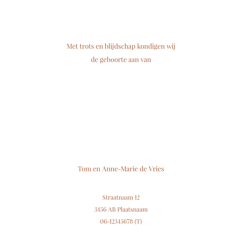 Mooi eigentijds ontwerp met waterverf patroon in verschillende tinten, goudfolie naam en minimalistische opmaak. De binnenzijde van dit vierkante kaartje is eenvoudig opgemaakt, met een lief gedichtje op een roestbruine ondergrond. Pas dit geboortekaartje zelf aan in onze ontwerptool.