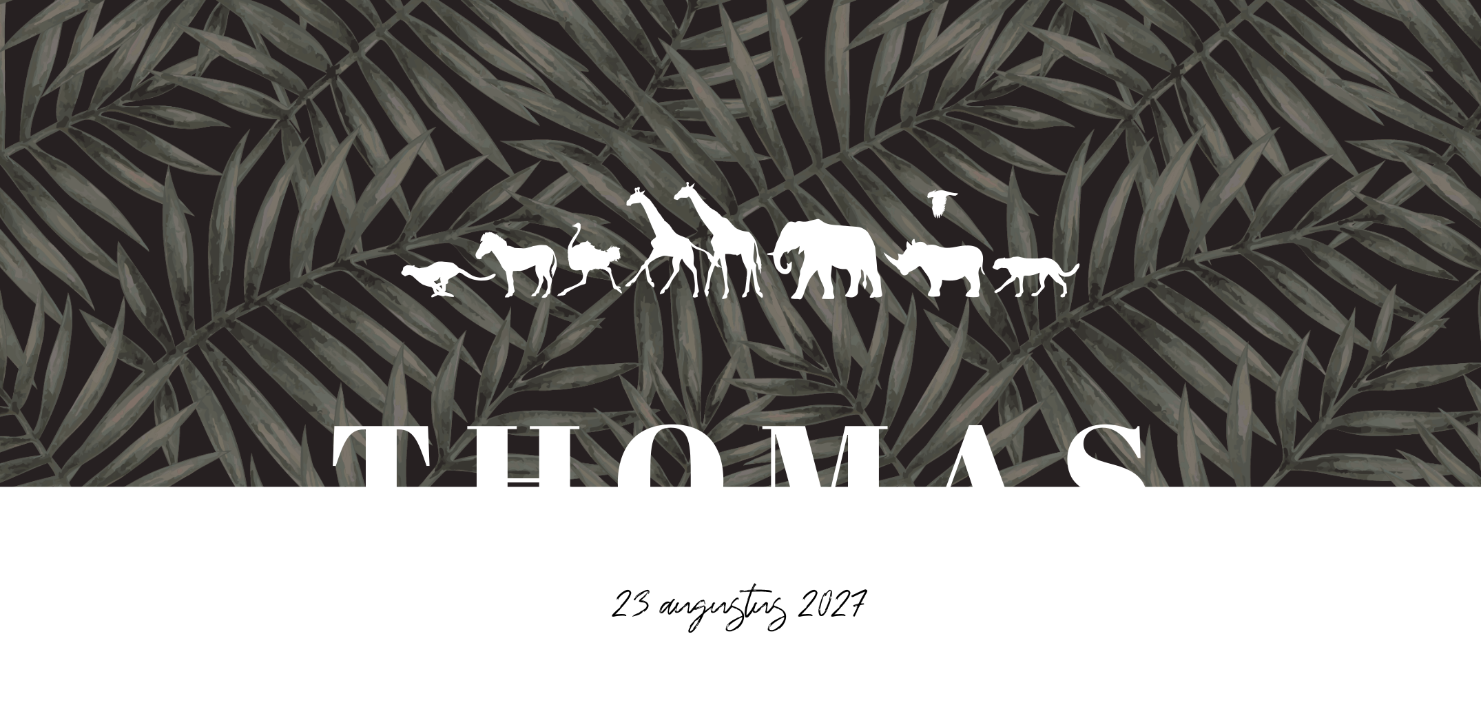 Dit trendy en tropisch geboortekaartje is gedecoreerd met allerlei safari dieren. Op de achtergrond zie je bladeren waardoor je een echte jungle vibe creëert. Op een rijtje zie je een struisvogel, olifant, giraf, luipaard, neushoorn en een zebra. Door de klassieke letters met goudfolie is dit kaartje helemaal af. In de kaart is er ruimte voor een persoonlijk tekstje met alle geboortegegevens.
