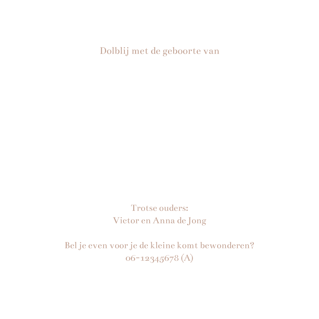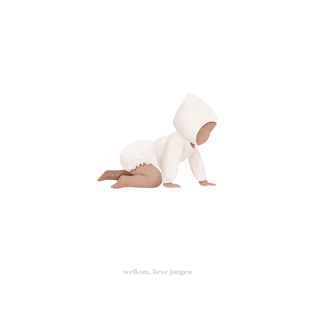 Op zoek naar een stijlvol en lief geboortekaartje voor je aanstaande zoontje? Ga voor dit witte kaartje met getekend kindje en goudfolie hartjes. Pas dit kaartje zelf aan in onze ontwerptool, pas bijvoorbeeld de achtergrondkleur of foliekleur aan. Of kies een andere illustratie van een baby in de map 'Waterverf baby'.