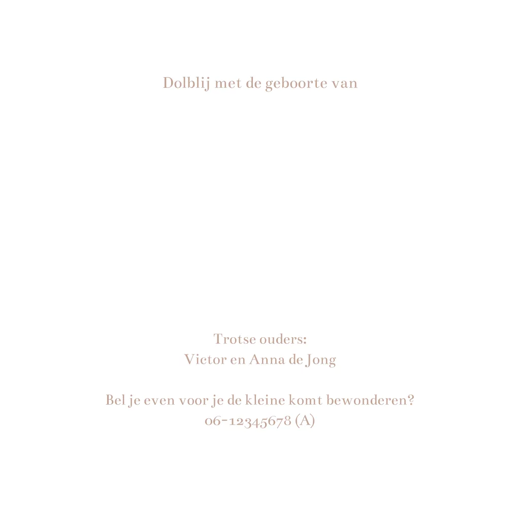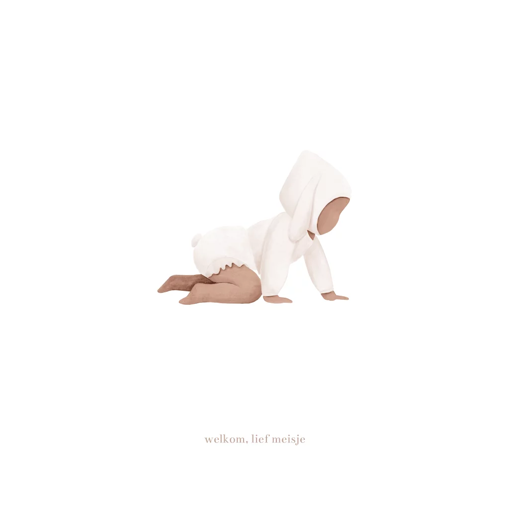 Op zoek naar een stijlvol en lief geboortekaartje voor je aanstaande dochtertje? Ga voor dit witte kaartje met getekend kindje en roségoudfolie hartjes. Pas dit kaartje zelf aan in onze ontwerptool, pas bijvoorbeeld de achtergrondkleur of foliekleur aan. Of kies een andere illustratie van een baby in de map 'Waterverf baby'.
