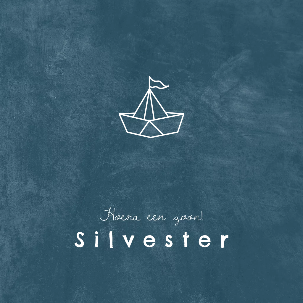 Ben je op zoek naar een geboortekaartje met een boot erop? Dan is dit mooie, simpele ontwerp met papieren bootje misschien iets voor jou! De zeeblauwe achtergrond kleurt prachtig met de zilverfolie naam en illustratie. Aan de binnenzijde kun je een mooie quote of kort gedichtje plaatsen onder het bootje. Aan de andere zijde is ruimte voor alle geboortegegevens van je zoontje. Pas dit geboortekaartje zelf aan in onze handige editor.