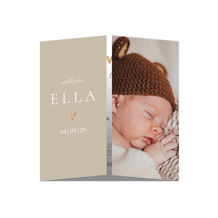 Op zoek naar een stijlvol en persoonlijk geboortekaartje? Dit tweeluik geboortekaartje opent vanaf het midden en combineert een warme, beige achtergrond met een eigen foto van jullie pasgeboren kindje. Links staat de naam in sierlijke witte letters met een lief hartje en de geboortedatum eronder. Rechts is ruimte voor een grote foto – perfect om jullie kleintje meteen aan iedereen te laten zien.