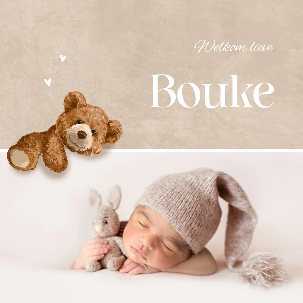 Dit schattige geboortekaartje is perfect om de komst van je kleintje aan te kondigen. Het ontwerp combineert een zachte beige achtergrond met een liefdevolle illustratie van een knuffelbeer die over een schuin geplaatste fotokader hangt. Hierin kun je eenvoudig je eigen babyfoto toevoegen, waardoor het kaartje een persoonlijke uitstraling krijgt. De naam is gedrukt in goudfolie. Bestel eenvoudig en pas het kaartje volledig naar wens aan!