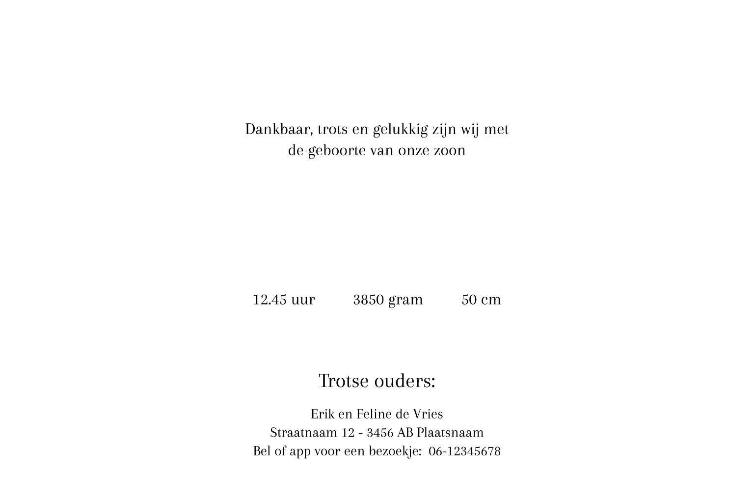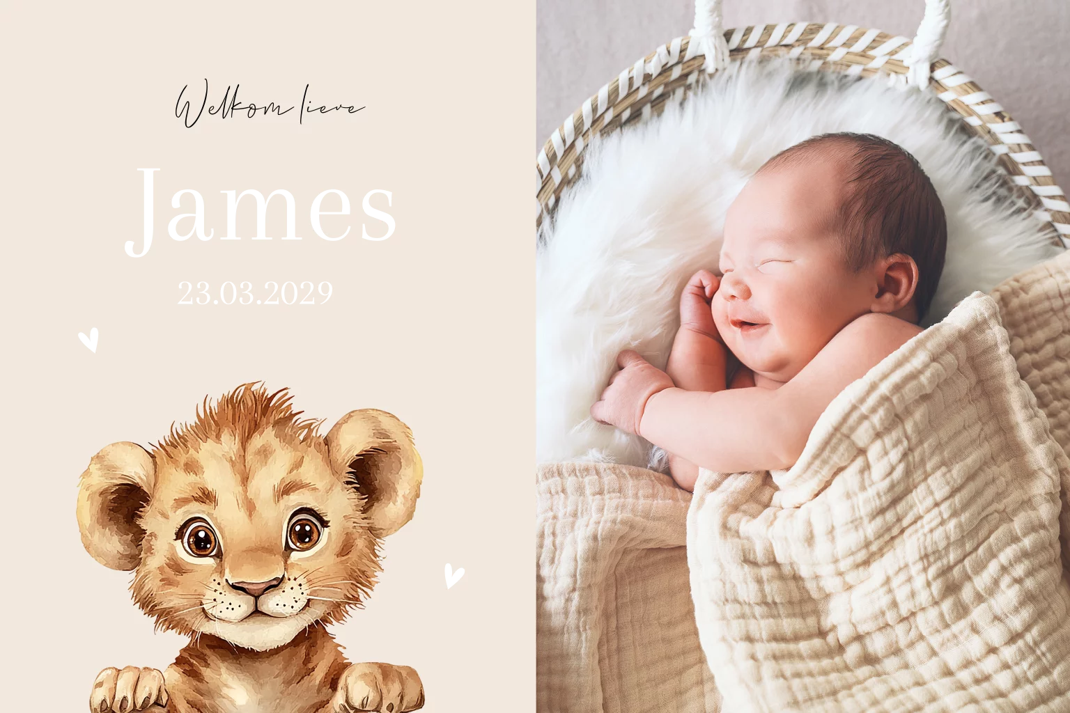 Dit geboortekaartje combineert een persoonlijke foto met een lieve illustratie. Links staat een schattig leeuwtje onder de naam en geboortedatum, gedrukt in goudfolie. Dit geeft het kaartje een luxe uitstraling. Rechts is ruimte voor een eigen foto van de baby. De zachte kleuren en rustige opmaak zorgen voor een warme uitstraling. Het kaartje is eenvoudig aan te passen via de editor.