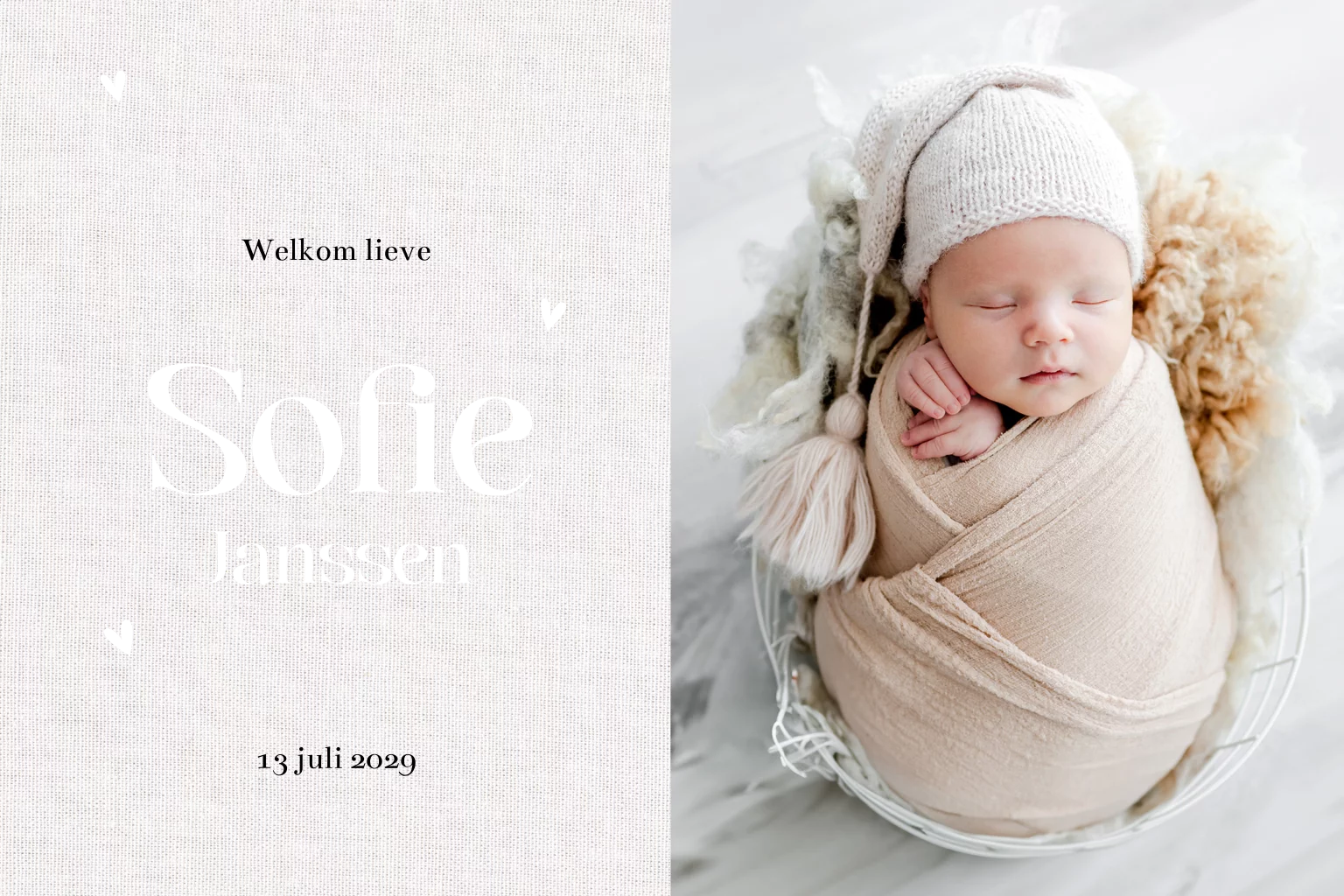 Dit stijlvolle geboortekaartje straalt warmte en eenvoud uit. De voorzijde biedt ruimte voor een mooie foto van jullie dochter, waardoor het kaartje direct een persoonlijke uitstraling krijgt. De naam van jullie meisje wordt in roségoudfolie, aangevuld met hartjes.