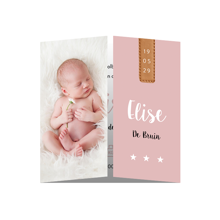 Heb je een mooie foto van je pasgeboren dochtertje gemaakt en wil je deze op een geboortekaartje gebruiken? Dan is dit tweeluik geboortekaartje superleuk. De kaart gaat vanuit het midden open met aan de ene zijde de foto en aan de andere zijde de naam. De datum staat op een plaatje van een leren labeltje. Pas de kaart naar wens aan en bestel een drukproef.