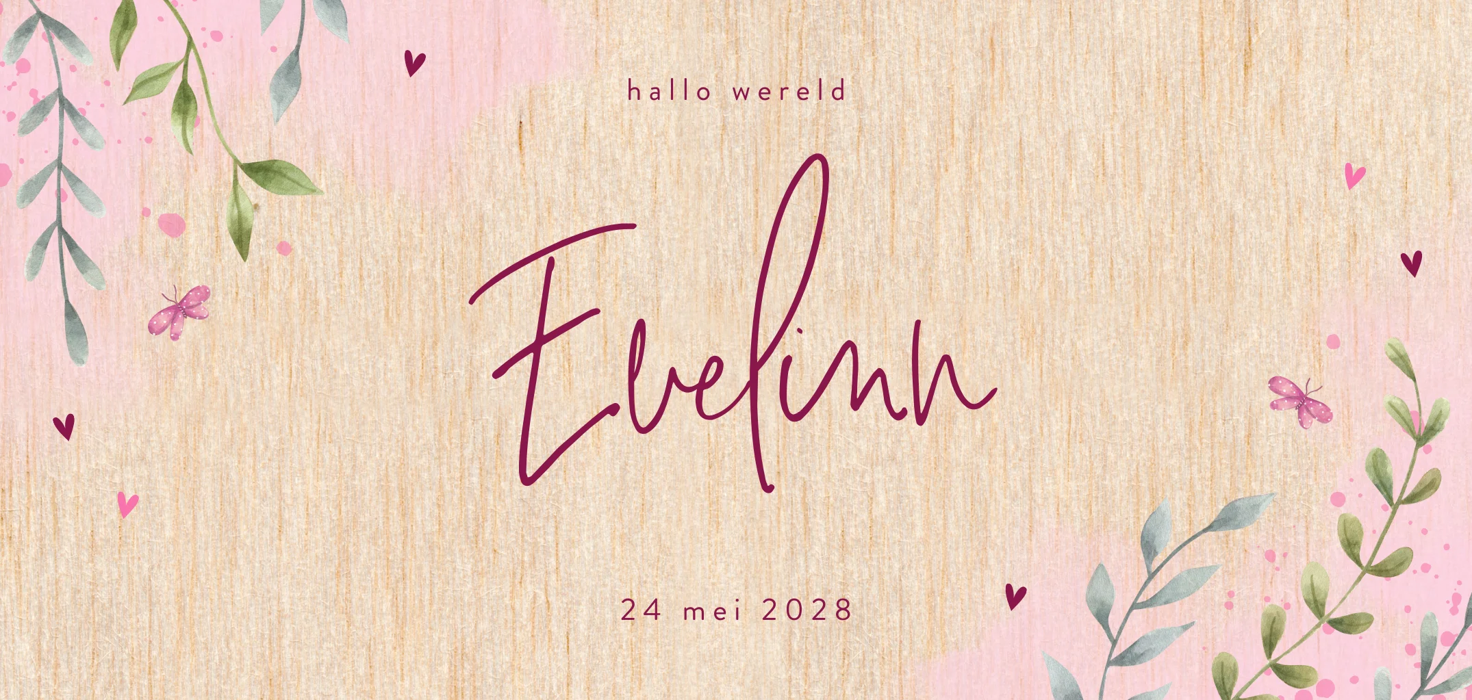 Botanisch geboortekaartje van hout met roze waterverf