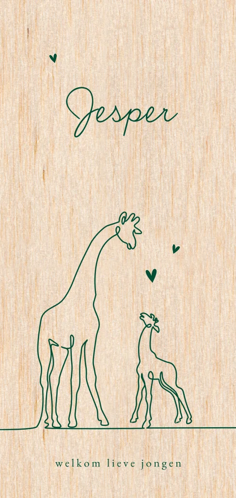 Ben je op zoek naar een origineel geboortekaartje? Ga dan voor een houten kaartje! Dit langwerpige ontwerp met giraf lijntekeningen wordt gedrukt op echt hout. Twee girafjes staan op de voorzijde in een donkergroene tint. Je kunt deze kleur zelf eenvoudig aanpassen in onze ontwerptool.
