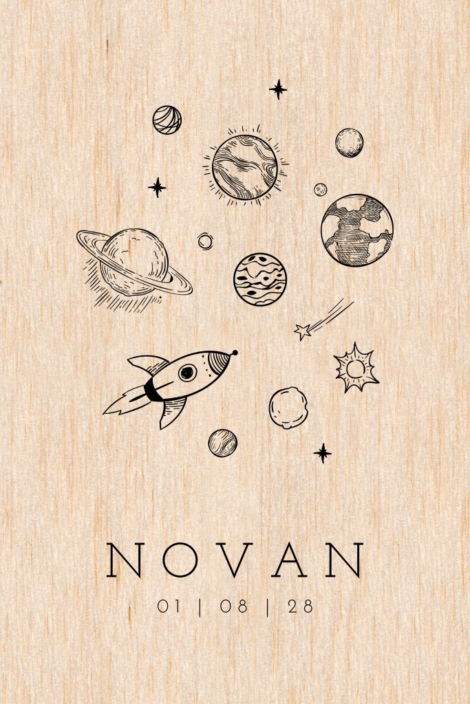 Een houten geboortekaartje met zwarte opdruk van sterren, planeten en een raket. De naam van je kindje komt in moderne typografie onder de illustraties.