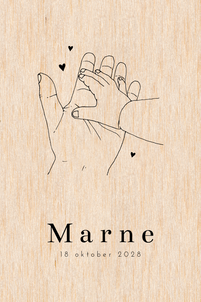 Houten geboortekaartje jongen met zwarte lijntekening handjes