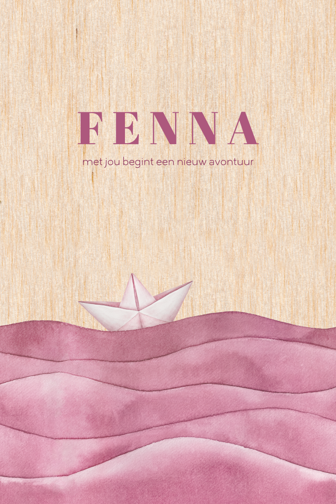 Een houten geboortekaartje met roze zee van waterverf en een klein, papieren bootje. Een mooi kaartje om de komst van jouw dochtertje mee aan te kondigen.