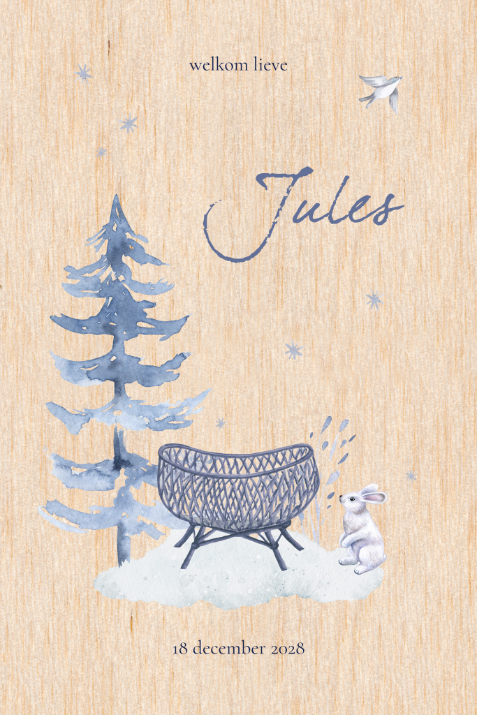 Wordt jouw kindje in de winter geboren? Kondig zijn of haar komst dan aan met dit lieve winterse geboortekaartje! Op dit houten kaartje staat een waterverf tafereeltje met wiegje in de sneeuw, een sneeuwhaasje en een vogeltje. Je kunt het ontwerp van deze kaart zelf aanpassen in onze editor.