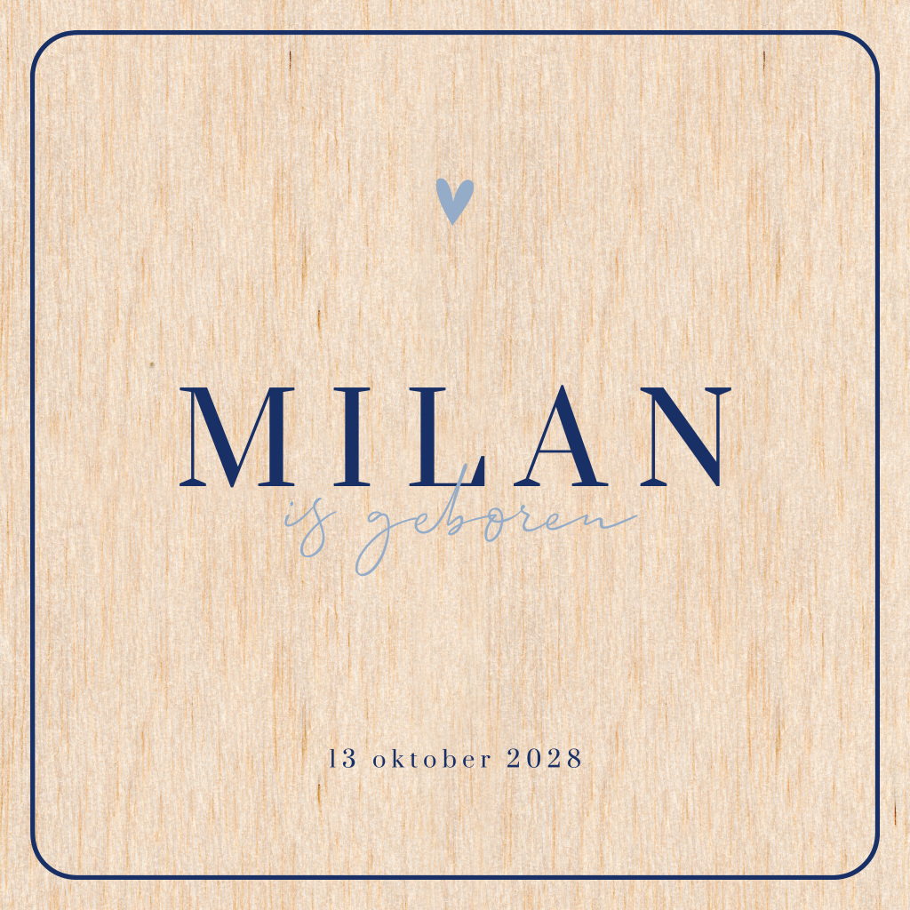 Klassiek geboortekaartje van hout met blauwe typografie en hartje